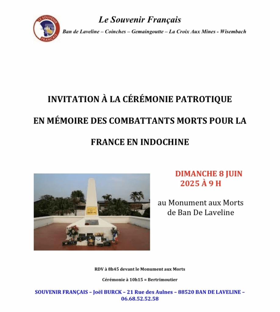Rendez-vous ce dimanche 8 Juin 2025 pour une cérémonie patriotique en mémoire des combattants morts pour la France en Indochine, organisé par le comité local du Souvenir Français.