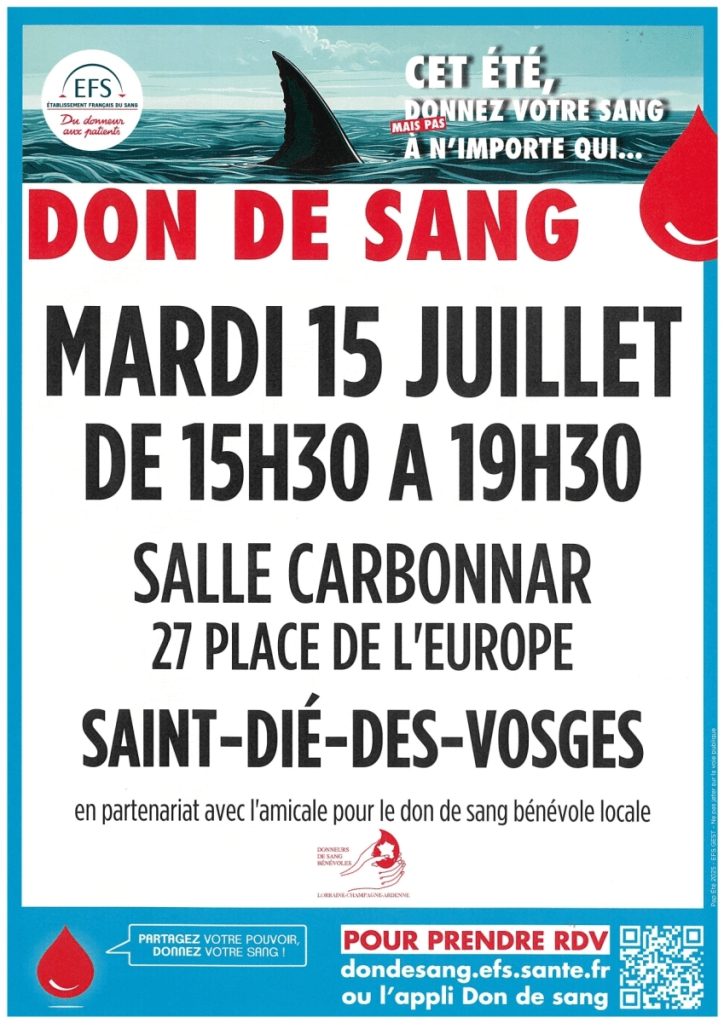 La prochaine collecte de sang à Saint-Dié-des-Vosges se déroulera mardi 15 Juillet 2025 à la salle Carbonnar, place de l’Europe, de 15h30 à 19h30.