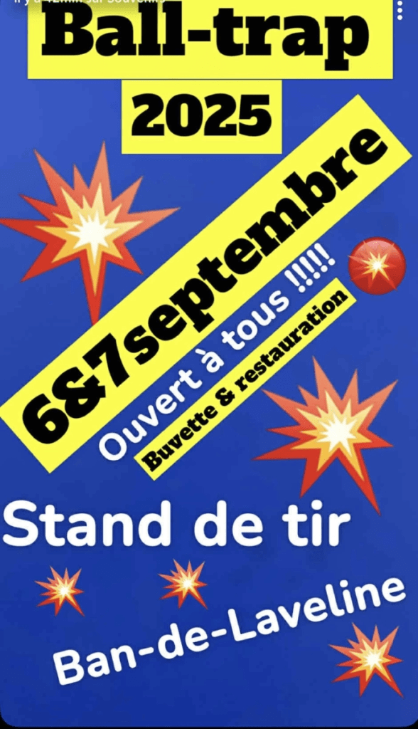 Rendez-vous au stand de tir de Ban-de-Laveline les 6 et 7 Septembre 2025 pour des concours de ball-trap, organisé par la société de tir de Ban-de-Laveline !