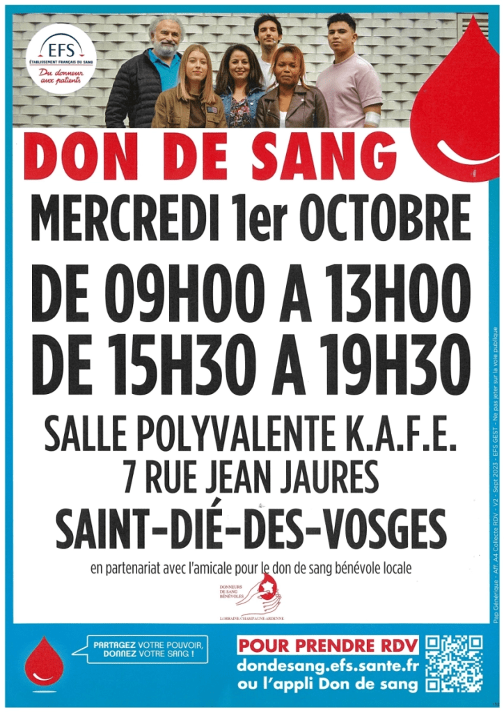 La prochaine collecte de sang à Saint-Dié-des-Vosges se déroulera mercredi 1er Octobre 2025 à la salle polyvalente K.A.F.E., de 15h30 à 19h30.