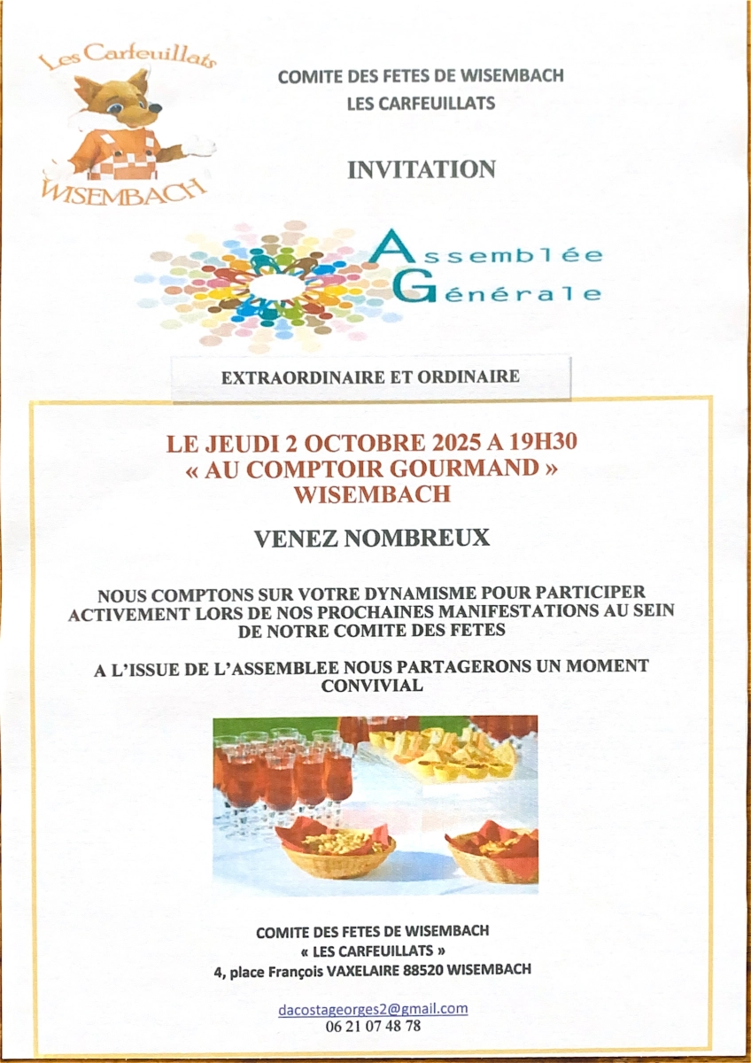 Le comité des fêtes de Wisembach Les Carfeuillats invite l’ensemble des habitants à participer à son assemblée générale extraordinaire et ordinaire, qui se déroulera le jeudi 2 Octobre 2025 à 19h30 au Comptoir Gourmand de Wisembach.