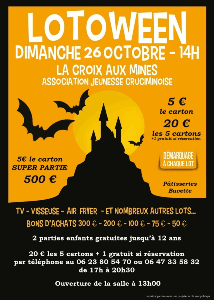L’association Jeunesse Cruciminoise organise son Lotoween le dimanche 26 Octobre 2025, dès 14h00 à la salle polyvalente de La Croix-aux-Mines !