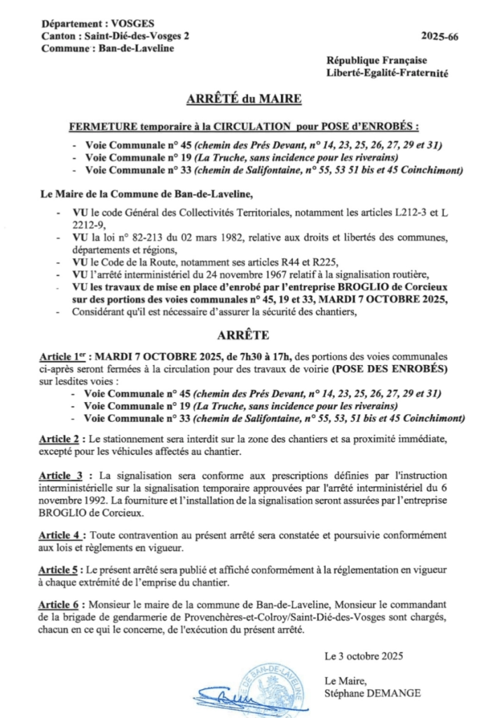 Demain mardi 7 octobre, la circulation sera perturbée toute la journée sur différents secteurs de Ban-de-Laveline, en raison de travaux de pose d’enrobés routiers.