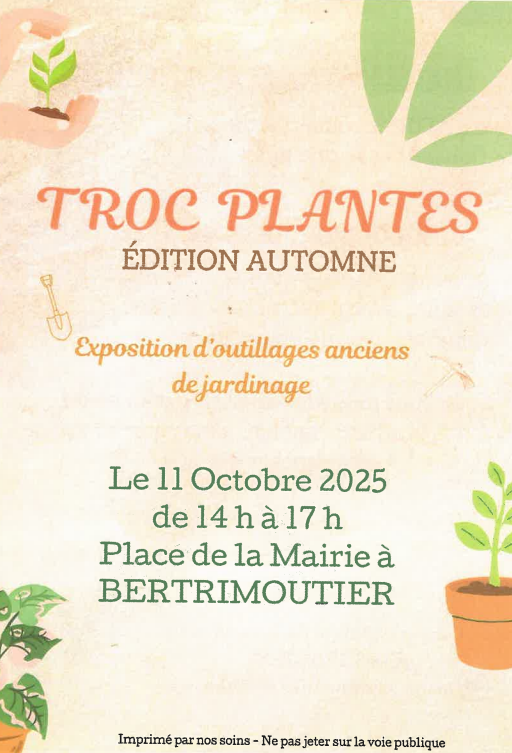 Ce samedi 11 Octobre 2025, ne manquez pas le traditionnel Troc’Plantes d’Automne, organisé par la municipalité de Bertrimoutier ! Rendez-vous dès 14h00 sur la place de la mairie !