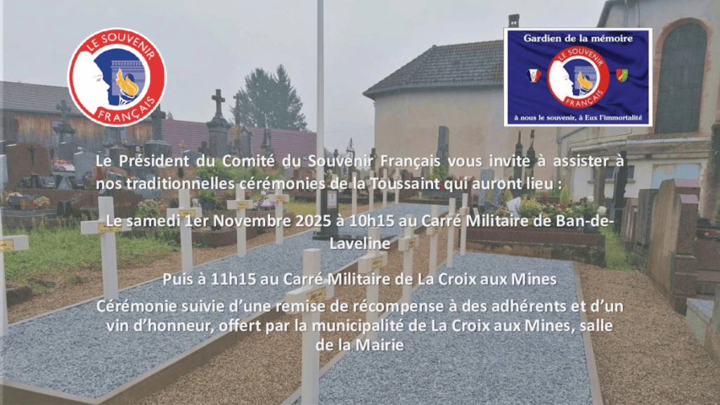 Pour ce samedi 1er Novembre 2025, deux temps forts marqueront cette matinée de mémoire : à 10h15 au carré militaire de Ban-de-Laveline et à 11h15 au carré militaire de La Croix-aux-Mines.