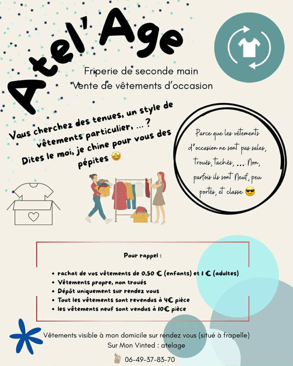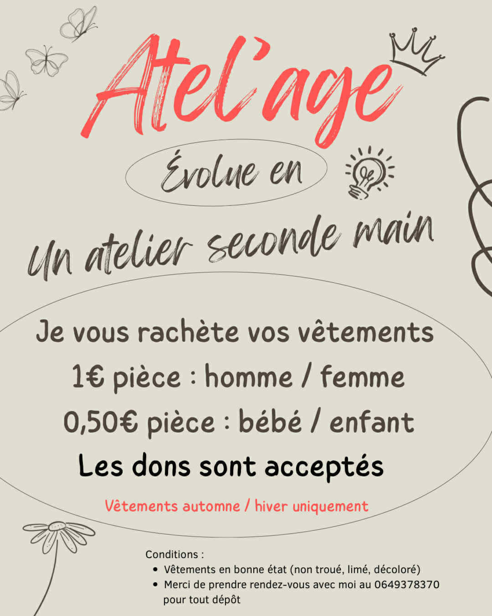 Pour toute demande, prise de rendez-vous, dépôt de vêtements ou recherche personnalisée, contacter Atel’Âge au 06 49 37 83 70. À Frapelle, la mode se vit désormais en seconde main… et en pépites avec impact écologique et petit budget !