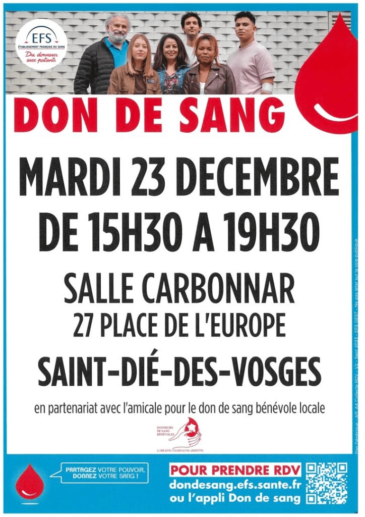 La prochaine collecte de sang à Saint-Dié-des-Vosges se déroulera mardi 23 Décembre 2025 à la salle Carbonnar, place de l’Europe, de 15h30 à 19h30.