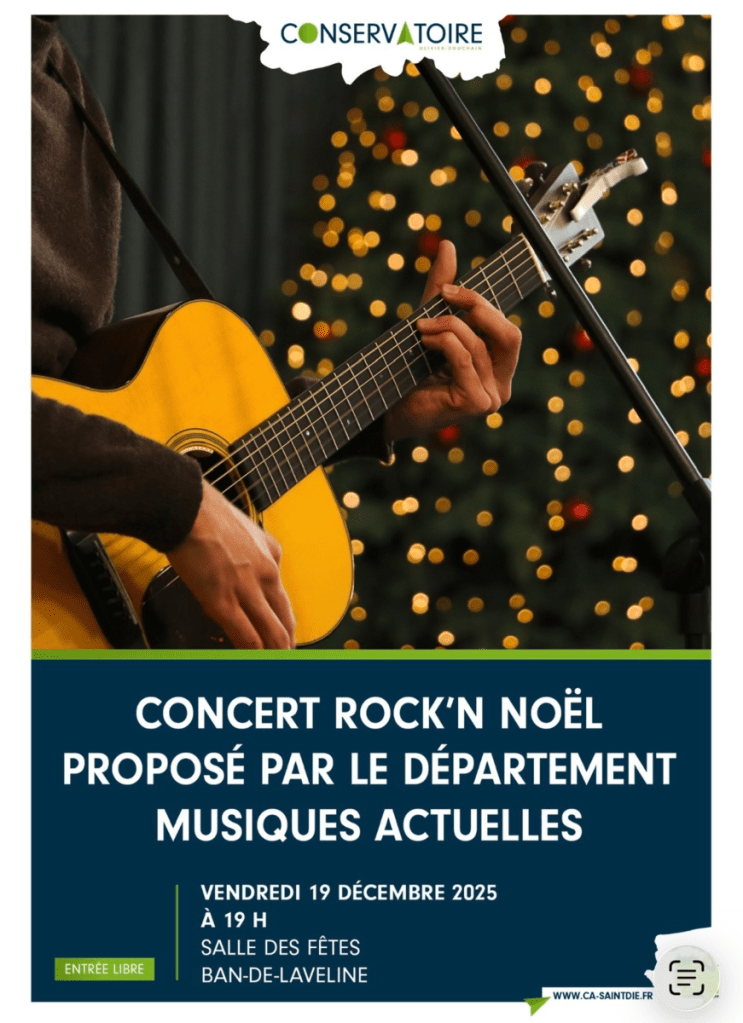 Rendez-vous demain vendredi 19 Décembre 2025 dès 19h00 pour un concert Rock’N Noël à Ban-de-Laveline, proposé par le département Musiques Actuelles du Conservatoire OLIVIER-DOUCHAIN !