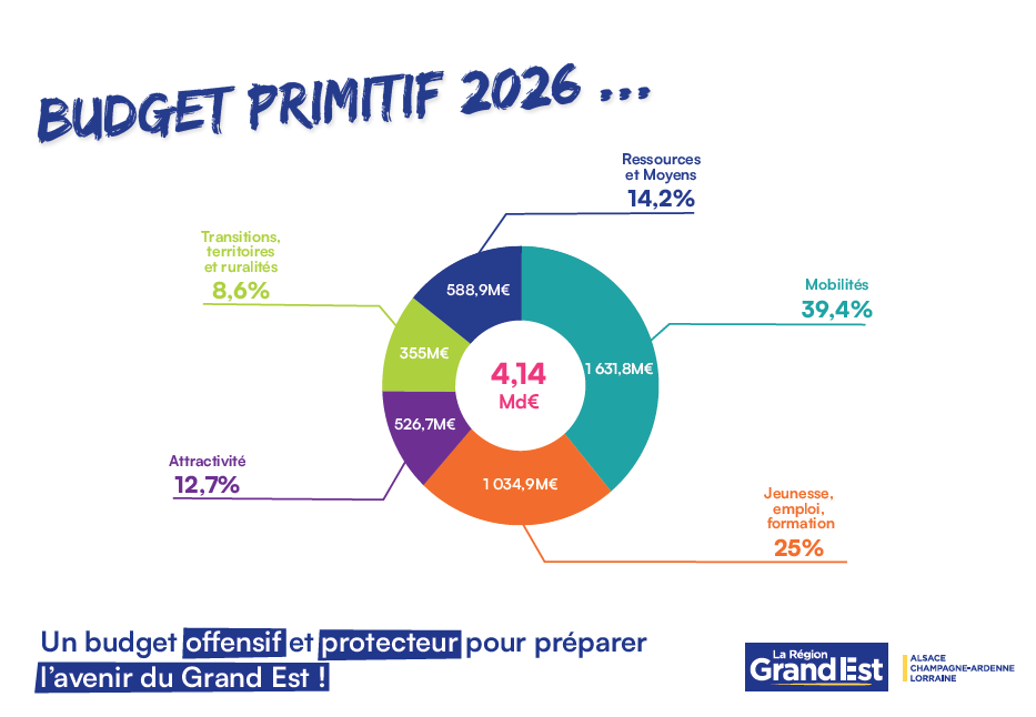 La Région Grand Est vient d’adopter son budget pour l’exercice 2026, s’élevant à 4 140 000 000 €. Dans un contexte économique national incertain, la collectivité fait le choix de la stabilité et de l’investissement pour offrir une visibilité claire aux entreprises, aux associations et aux communes de notre territoire.
