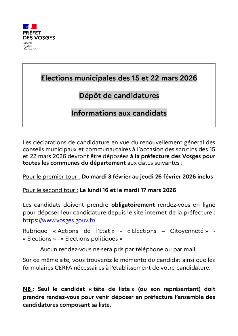 Tous les dossiers devront être déposés à Épinal en préfecture selon les dates suivantes : pour le premier tour, du mardi 3 Février au jeudi 26 Février 2026 inclus et pour le second tour, les lundi 16 et mardi 17 Mars 2026.