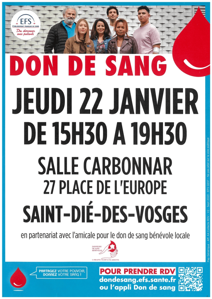 La prochaine collecte de sang à Saint-Dié-des-Vosges se déroulera jeudi 22 Janvier 2026 à la salle Carbonnar, place de l’Europe, de 15h30 à 19h30.