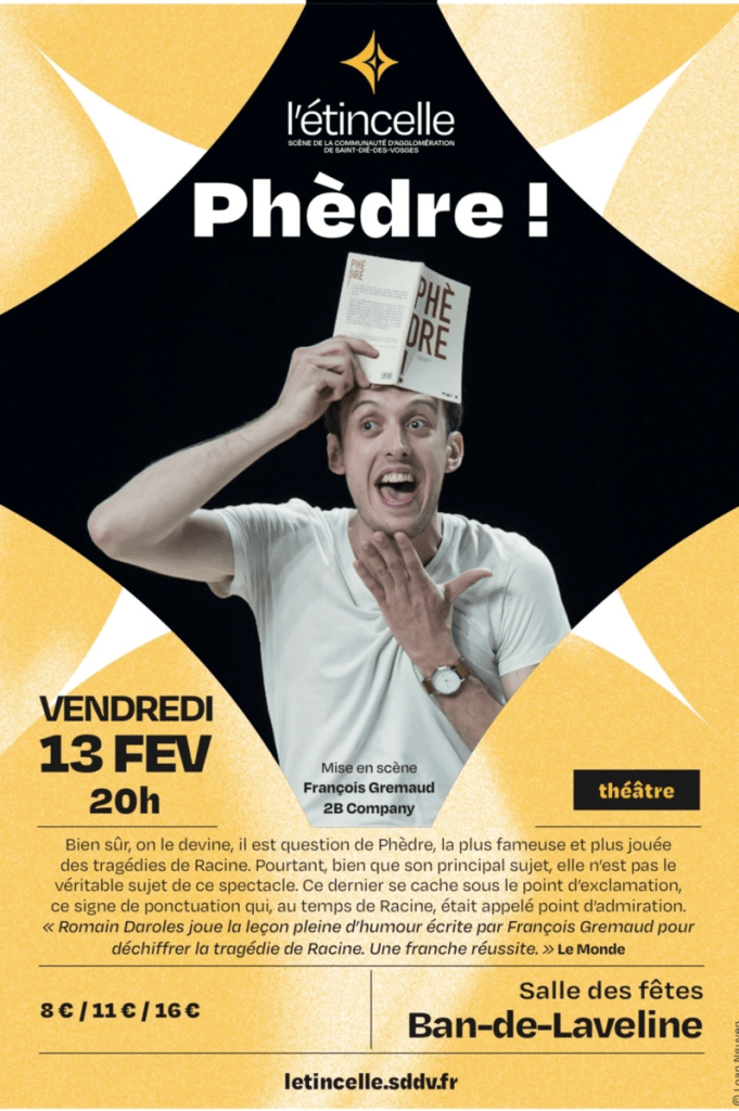L’Étincelle, la scène de la Communauté d’Agglomération de Saint-Dié-des-Vosges, s’installe à la salle des fêtes de Ban-de-Laveline le vendredi 13 Février à 20h00. Au programme : « Phèdre ! », une mise en scène audacieuse et malicieuse signée François Gremaud.