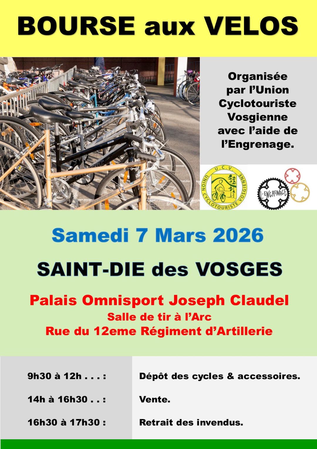 Le printemps approche et il est temps de préparer vos sorties en forêt ! L’Union Cyclotouriste Vosgienne, avec le soutien de l’association l’Engrenage, organise sa traditionnelle bourse aux vélos ce samedi 7 mars 2026. L’événement se tiendra au Palais Omnisport Joseph Claudel de Saint-Dié-des-Vosges (salle de tir à l’arc).