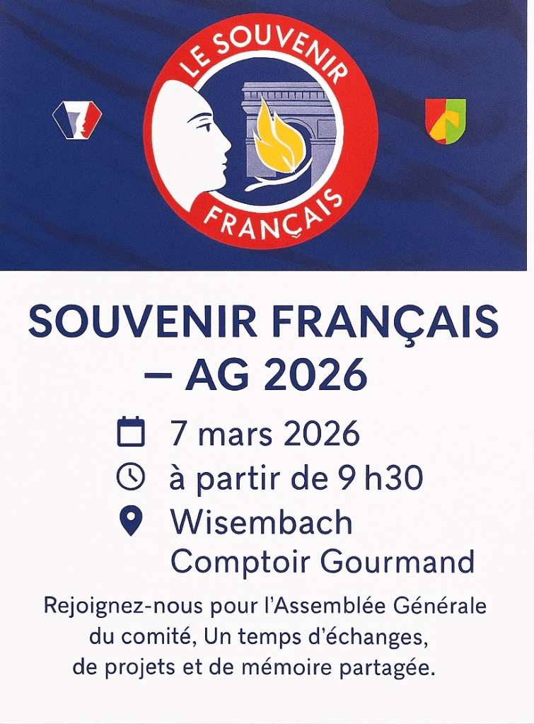 Le comité local du Souvenir Français invite à participer à son Assemblée Générale annuelle ses membres, ainsi que toutes les personnes attachées au devoir de mémoire. La réunion se tiendra ce samedi 7 mars 2026 au Comptoir Gourmand dès 9h30, à Wisembach.